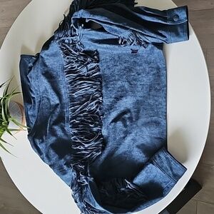 Stylish utility jacket with fringe details. Deep blue suede adds sophistication. Ideal for versatile wear. so soft .. like new.. no signs of wear. how fun!