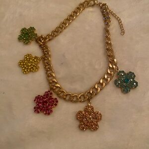 This stunning gold chain necklace features vibrant flower charms in pink, green, yellow, and blue. Perfect for adding a pop of color to any outfit.