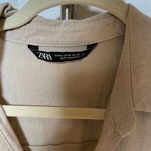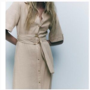 Zara Women’s Khaki Linen Blend Belted Midi Shirt Dress Sz XS