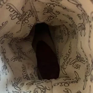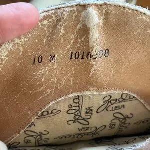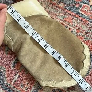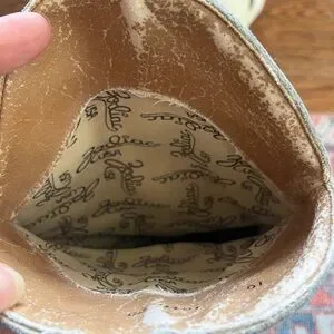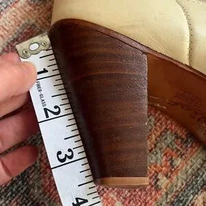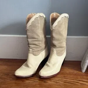 These STUNNING boots are ready for the funnest party! They are a lovely cream/off white and almost yellow color leather with a greyer tan shaft in suede. They hit mid-calf with a 3.75” stacked wood heel. They are in very good condition, with the following flaws: 1) some minor scuffs and discoloration; 2) the inside leather is peeling, see photos; 3) there is one part of the right boot that is separating a bit from the footbed, this could be repaired; 4) the inner footbed is pilly - not a problem if you’re wearing socks. Otherwise they’re sexy and spicy as heck and the belles of the ball.