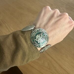Sterling Silver (925 stamp on the back) bracelet featuring turquoise coin designs. Has a toggle clasp.