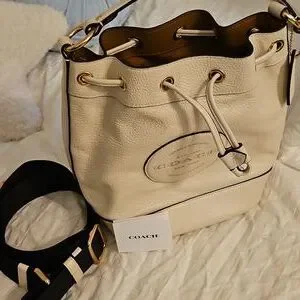 Coach Dempsey Drawstring bucket bag. cream pebbled leather brown lining with adjustable strap. Used once. No signs of wear, exc. condition.