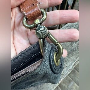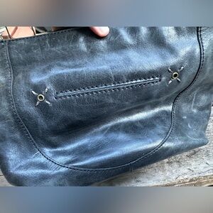 Beautiful vintage style pebbled leather, black with a blue tint. Pretty western style strap, braided zipper pocket tab. Inside is perfect.