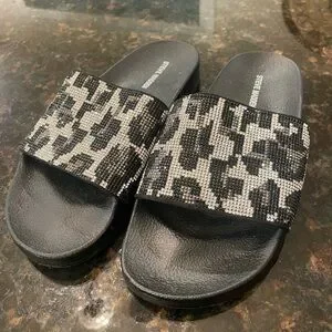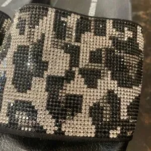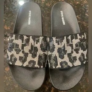 Stylish Steve Madden sandals with a bold black and silver “cheetah” rhinestone pattern. Perfect for casual wear.