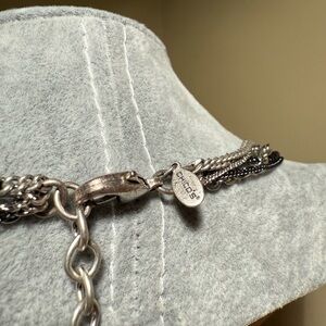 This is a visually striking multi-strand Chico’s fashion necklace featuring an array of different chain types and tones. It incorporates several individual chains in silver-tone and black/gunmetal-tone, artfully connected and divided by large, textured rings. One prominent ring on the right side of the image has a distinct bronze tone finish, adding a warm accent to the otherwise cool-toned palette. The varying chain textures and the strategic placement of the rings create a dynamic, layered look, making it a versatile accessory suitable for enhancing various outfits. Length 32 inches with additional 4 inches in the extender