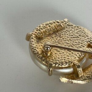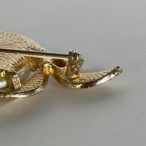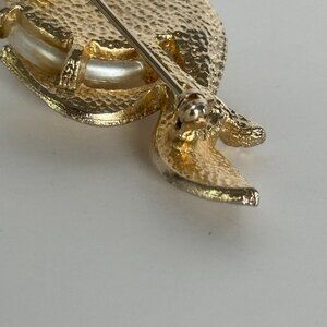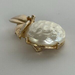 This elegant vintage brooch features a large faux pearl set against a detailed gold-tone leaf design. Perfect for adding a touch of sophistication to any outfit, this brooch is ideal for collectors or those who appreciate timeless accessories. Elevate your ensemble with this charming piece.
