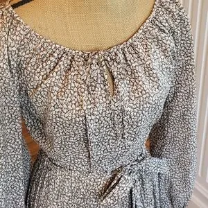 The blouse has a tie closure, a gathered neckline, and 3/4 sleeves.