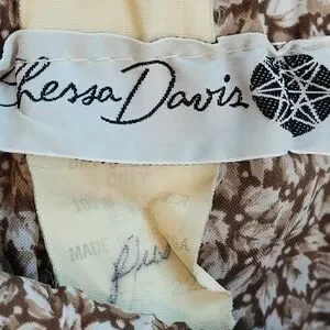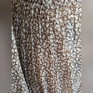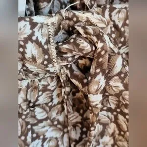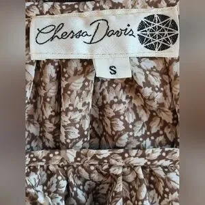Chessa Davis Vintage 70s Boho maxi skirt set in a brown/ivory leaf design polyester with a peasant blouse and a pleated maxi skirt.