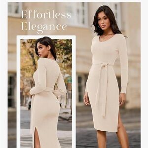 This chic beige knit dress features a flattering belt and ribbed texture, perfect for any occasion. Side splits and midi length. Size Small.