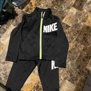 Sleek black Nike jacket with a striking white logo. Features a vibrant yellow zipper for a pop of color.