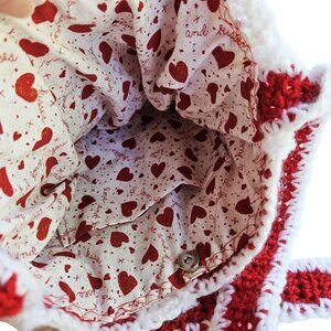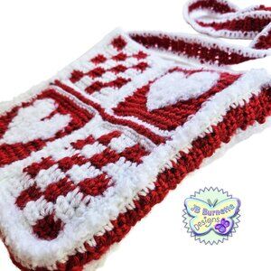 Handmade with love, this adorable shoulder bag is a crochet purse featuring a hearts-and-checks pattern on the front and back, as well as a glittery "love and kisses" hearts-pattern lining on the inside. This unique beauty is the perfect accessory for any outfit. Spoil yourself with this lovely bag, or give it as a beautiful gift for a crochet lover on a birthday or for the holidays.