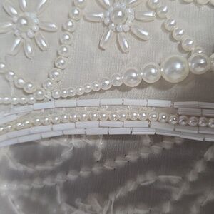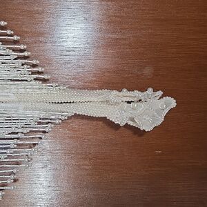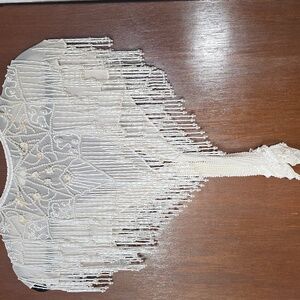 Elegant beaded fringe shawl by David Howard. Features intricate beadwork on cream colored silk.