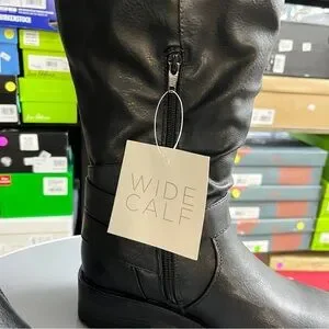 Adjustable calf buckle. Size 7.5 WC measures 8.5” across with the buckle on the middle clasp as pictured