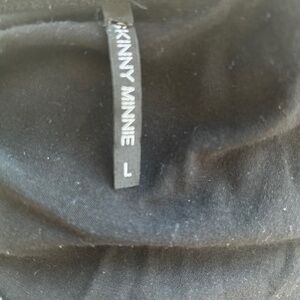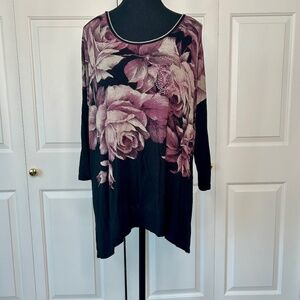 This Skinny Minnie long-sleeved t-shirt/ tunic is a size large. The base colour and back of the shirt is black. It has a beautiful purple and cream floral design. Beautiful crystal embellishments add beautiful details. This shirt has Lycra/ spandex that ensures the shirt drapes beautifully over the body. The Lycra also maintains the shirt’s shape. This shirt flutters over the body. The flounce bottom of the shirt adds a flattering detail. This shirt is in excellent shape.