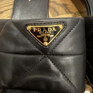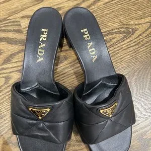Elegant black mules with quilted design. Features iconic Prada logo. Perfect for stylish outings.