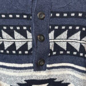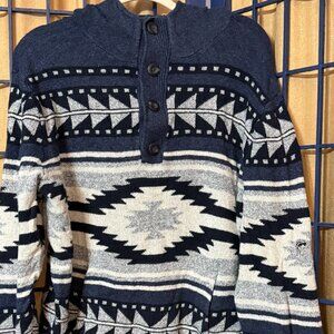 💫 Classic American Eagle men’s sweater featuring a navy, gray, and ivory Southwestern / Aztec-inspired pattern with button-up shawl collar. Heavyweight knit with ribbed cuffs and hem.