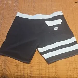 Stylish Hurley board shorts. Black with white stripes. Lace-up front. Perfect for swimming.