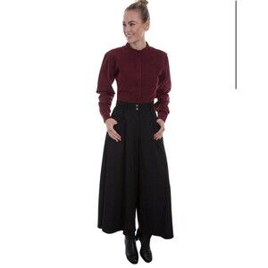 The Scully Burgundy Super Wide Leg High Rise machine washable Sueded Fabric Poly Pants in size Small are a versatile and stylish addition to any woman's wardrobe. These pants feature a solid red color, a high-rise waist with a flat front, and a wide-leg style for a comfortable fit. Made from polyester, they are machine washable for easy care. The pants are suitable for various occasions, including travel, weddings, parties, casual outings, formal events, work, and business meetings. With a touch of vintage flair and a trendy ankle length, these pants are perfect for those who appreciate a blend of classic and contemporary styles.