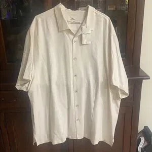 Classic ivory shirt with short sleeves. Ideal for casual outings. Features a relaxed fit and button-down style.