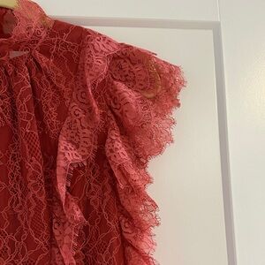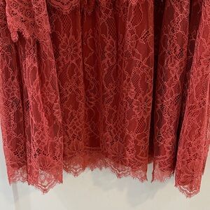 Elegant lace midi dress with flutter sleeves. Ideal for special events. 100% Nylon, only worn once. Rust colored