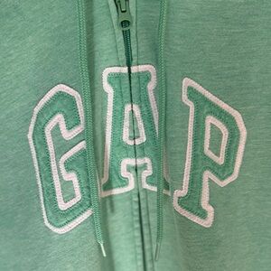 Cozy and classic GAP hoodie in a fresh mint green color. Features the iconic GAP logo embroidered on the chest, a full zip front, drawstring hood, and kangaroo pockets. Made from soft fleece for comfort and warmth.