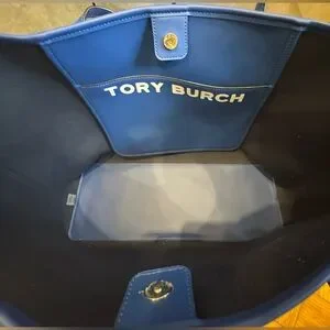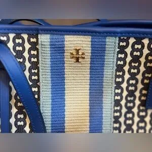 Elevate your style with the Tory Burch tote bag in a chic blue and cream design. Perfect for any occasion, this bag combines elegance with functionality.