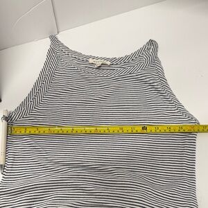Chic sleeveless maxi/midi 36” long dress with subtle gray stripes. Ideal for versatile styling. 16” pit-to-pit but stretchable fabric so please keep that in mind. Good pre-owned condition no rips, holes or tears. Some small stains may have missed my aging eyes but all else looks good!