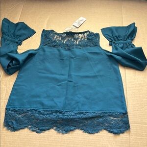 This stunning blue blouse by Jessica Simpson features elegant bell sleeves with ruffled cuffs and intricate cut-out details. The embellished design includes delicate lace and floral embroidery, creating a chic and stylish look. Perfect for adding a touch of sophistication to any outfit.