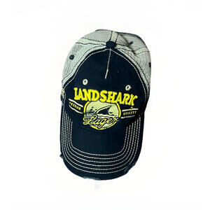 LandShark Lager distressed trucker hat in navy and tan with mesh back and embroidered front logo. Features contrast stitching, “Fins Up!” side tag, and printed shark fin trim inside band. Adjustable hook-and-loop back strap. Pre-owned with intentional factory distressing and light general wear. See photos for full condition.