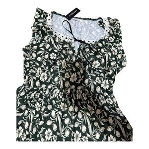 Elegant dark green and cream floral dress. The dress has a stretchy waist, lace trim around the neck and a functional ribbon that can be tied or left open depending on your style. The capped sleeves have a slight ruffle. The perfect dress for any occasion.