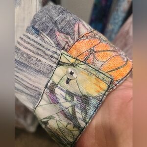 It's a really pretty top with a mandarin collar and buttons at wrists. Any questions at all, please ask.
