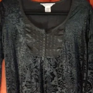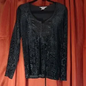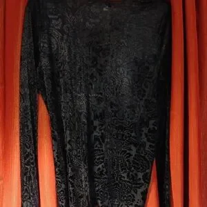 Chic black blouse with floral pattern. Long sleeves and scoop neckline. Perfect for versatile styling.