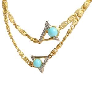 Authentic Valentino statement necklace featuring a luxurious gold-tone chain with intricate swirl links and signature triangle pendants adorned with vibrant turquoise stones and pavé crystal accents. The elegant double-layer design adds sophistication and versatility—perfect for dressing up any look. The clasp is secure and features subtle Valentino markings. 36” opera length.