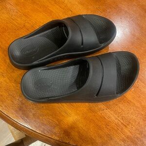 Comfortable black slide sandals by Oofos. Perfect for casual wear. New, never worn. Size 10, see photos