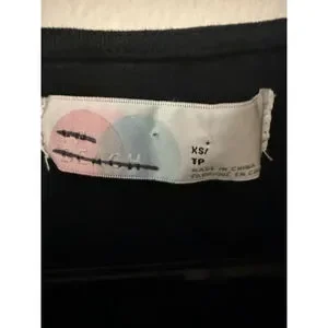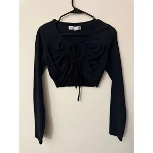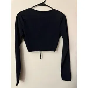 This is a pre-owned black long-sleeve cropped top, size XS, made in China. The front features a V-neckline with a central drawstring detail, creating a ruched effect. The back is plain. The fabric appears to be a stretch knit material. The brand tag, partially obscured, shows "BEACH" and indicates size "XS/TP". There are no visible imperfections or signs of significant wear.