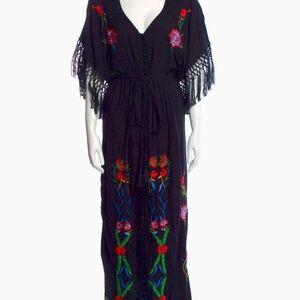 Elegant black maxi dress with colorful floral designs. Features fringe sleeves. Perfect for stylish occasions.