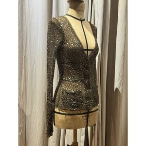Custom embroidered pucker sequin mesh in a brown/ army color with tiny sequins, finished with tiny ruffle edging at neckline.
