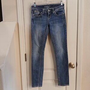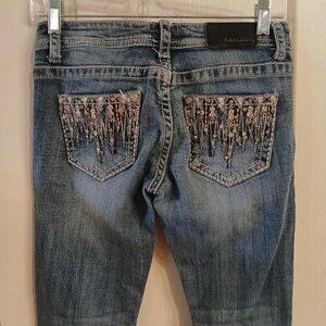 Y2K Aesthetic Grace in L.A. low-rise skinny jeans with thick stitching, rhinestones, embellished, and embroidered pockets in size 25.