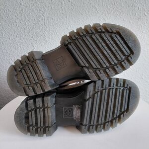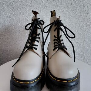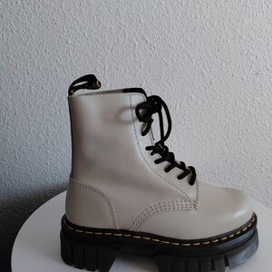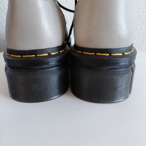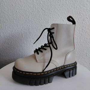 DR. MARTENS Women's US 6 Gray Nappa Leather Audrick 8-Eye Platform Laced Boots. Leather upper. Leather /fabric lining. Heel 2" . Shaft 6" tall.