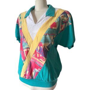 This cool Retro style collared 80's Blouse is a soft cotton with a kind of a nylon feel to it, and it has great 80's abstract style pattern over a color block v-neck bodice. It cinches at the hips and at the arms. It still has the original vintage shoulder pads attached to the shoulders.