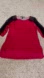 From the front: Shiny red color with sleeves. Top of the sleeves is black lace