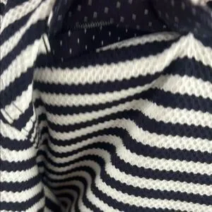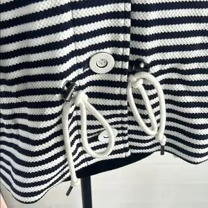 Chic blue and white striped jacket by Cabi. Features button details and a drawstring waist for a tailored fit.