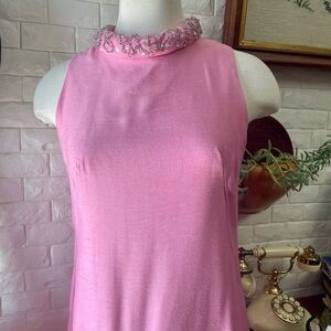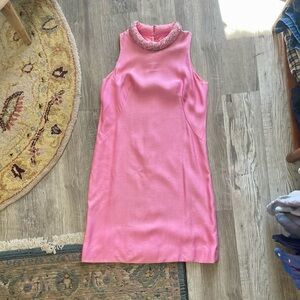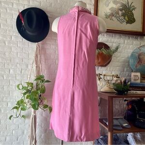 Vintage 1950s 1960s Handmade Bubble Gum Pink Mini Shift Dress Embellished Collar, No Tag Size, Small based on measurements—please refer to measurements below to ensure your preferred fit