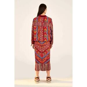 Keywords: Farm Rio jacket, fringe bomber, multicolor stripe coat, statement jacket, boho chic, festival fashion, XS jacket