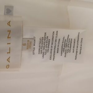 comes with garment dust bag, extra buttons, hanger, and bustle instructions