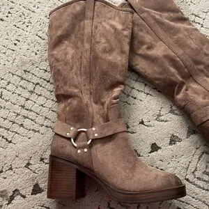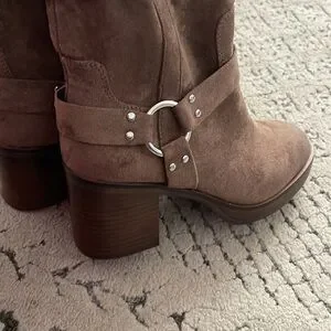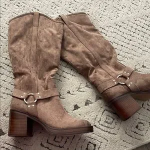 Stylish tan heeled boots. Suede finish with buckle detail. Perfect for any occasion.