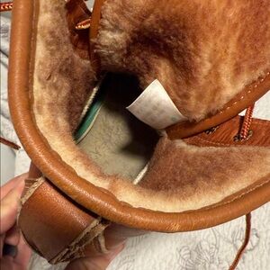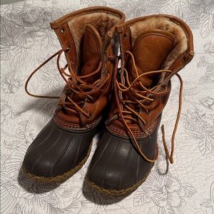 Classic Durable tan and brown boots with a rugged lace-up style and fleece lined insulated interior. Made in Maine. Ideal for outdoor wear. These boots are women’s size 7, but run large. Feel free to reach out with any questions.