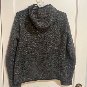 Warm fleece jacket with textured knit outer. Features a comfortable fit and zipper pockets. Slight pilling.