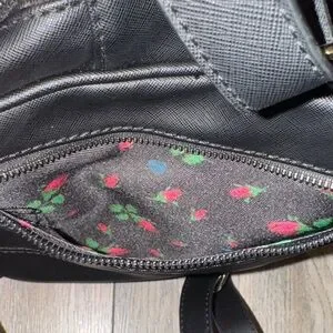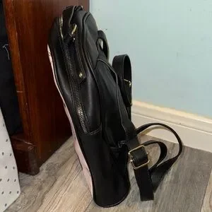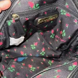 Vintage Mini Backpack. Great preloved condition with minor inner lining paint stain. As shown in last photo. Outer shell in very nice condition. Some hardware wear. Stylish backpack by Betsey Johnson featuring a cute dog pattern. Pink base with black trim.