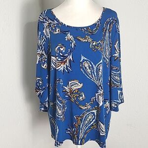 Chico's Blue, Gold & White Floral Top with Bell Sleeves, Size 2, 2X